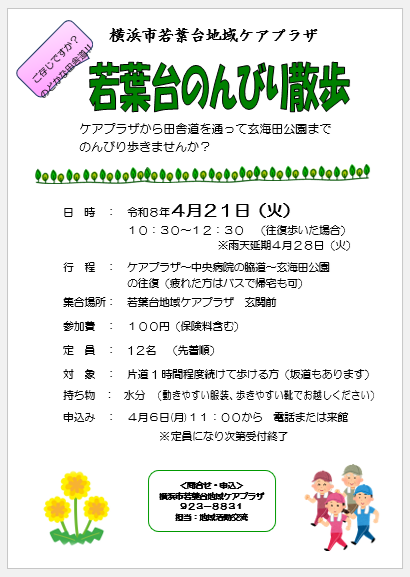 令和9年 1/12・ 2/9・3/9場 所:若葉台地域ケアプラザ 2階 多目的ホール講 師:健康体力運動士 當銘 恵美子 氏対象者:若葉台在住の65歳以上の方で1時間立って体操が出来る方参加費:無 料持ち物:運動靴・水分・タオル ※動きやすい服装でお越しください定 員:20名(申込多数の場合は抽選)